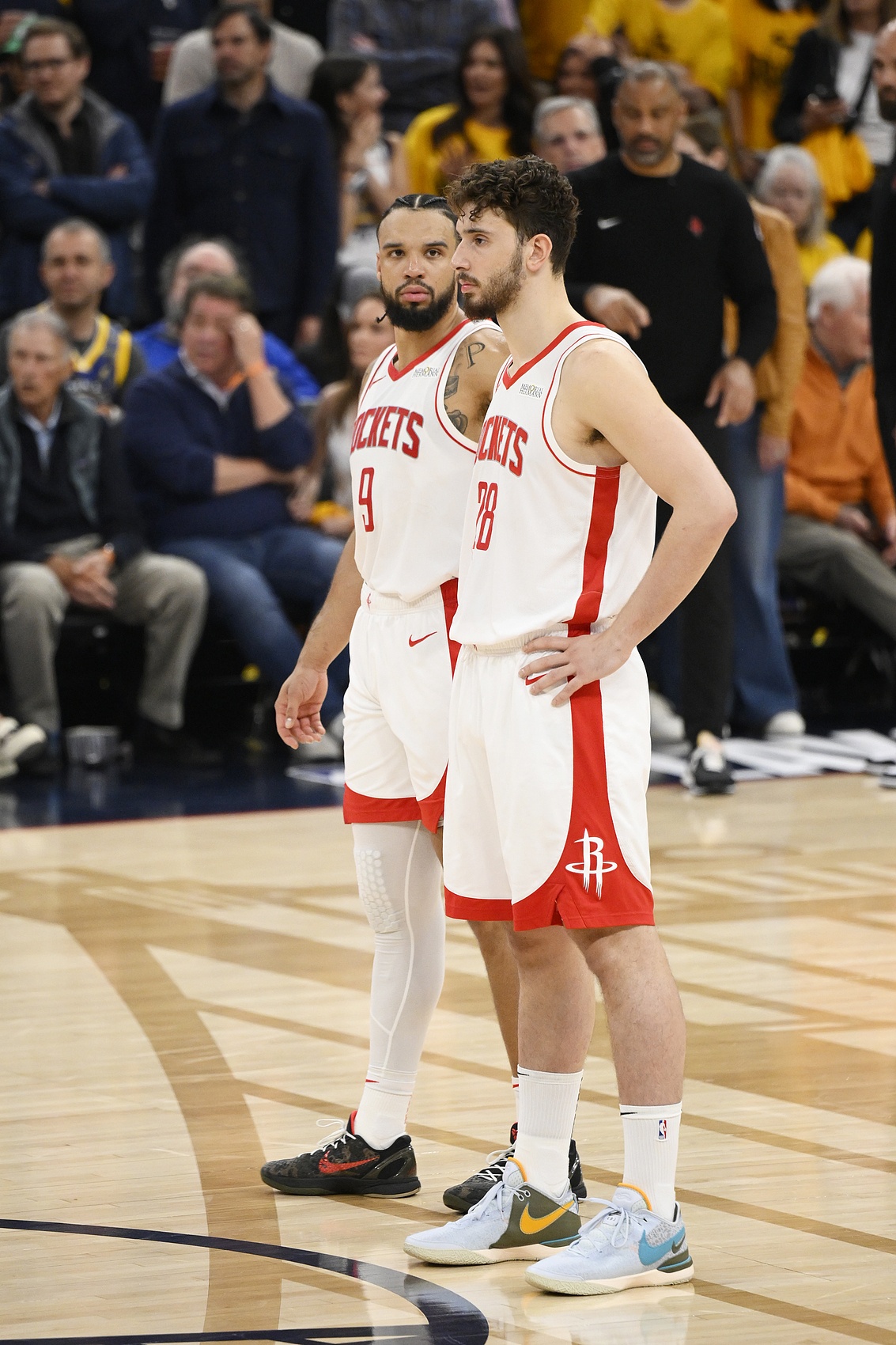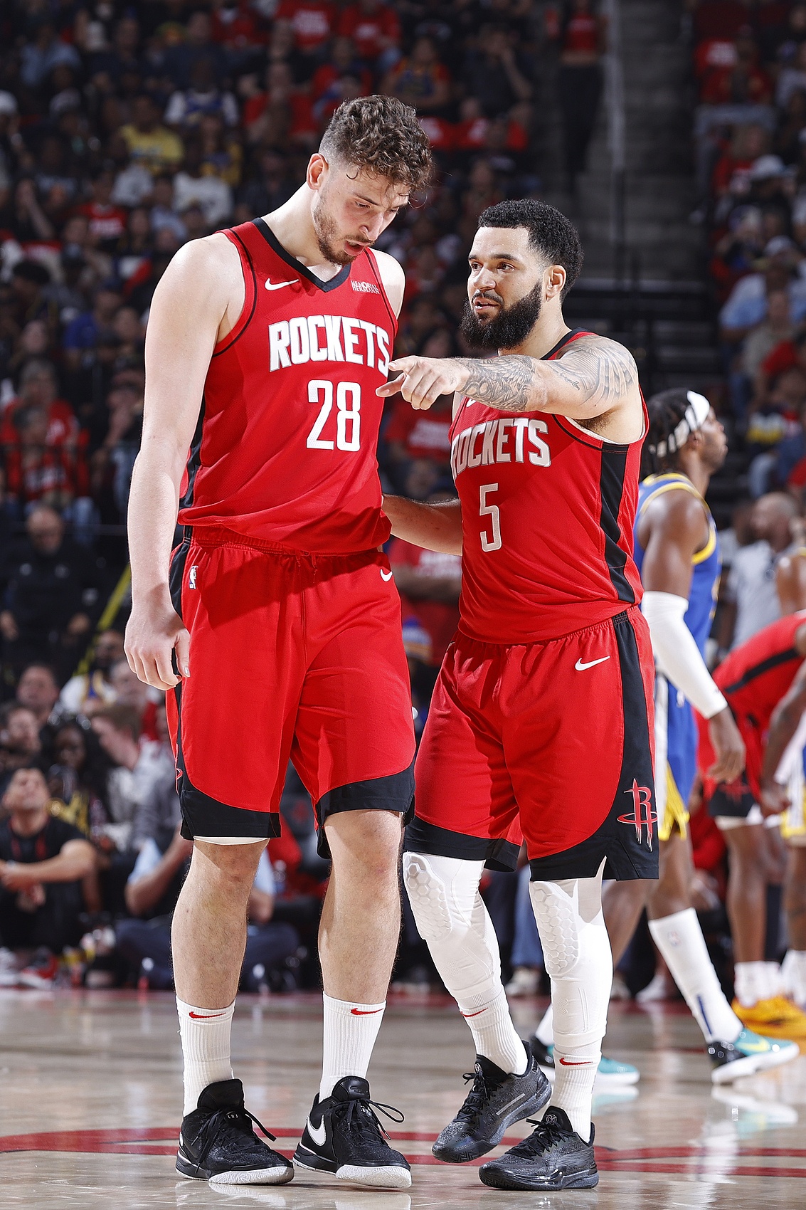 在火箭队的开场战术中,他们让杰伦-格林发起进攻,并利用狄龙-布鲁克斯为阿尔佩伦-申京做掩护,而勇士队则轻松地采用联防。今年三分命中率不足30%的阿门-汤普森被安排在底角。本赛季三分命中率仅为23.3%的申京在弧顶没有威胁,而且他与格林的二人配合空间太过狭小,无法产生真正的影响。这次进攻的结果是申京仓促出手,抢到篮板,然后失误。一次典型的火箭队式进攻。