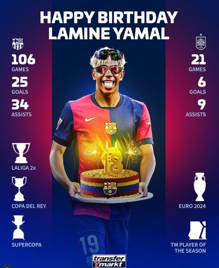 7月13日讯 亚马尔在今日正式迎来自己的18岁生日,而放眼世界足坛历史也少有球员能在刚满18岁时就能取得亚马尔当前的成就。